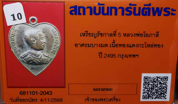 เหรียญรัชกาลที่5 หลวงพ่อโอภาสี อาศรมบางมด พิมพ์รูปหัวใจ เนื้อทองแดงกะไหล่ทอง ปี2495 จ.กรุงเทพฯ + บัตรG-pra สภาพเดิมค่ะ สภาพตามรูปทุกประการค่ะ