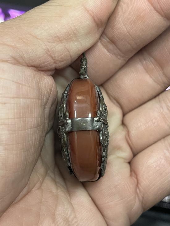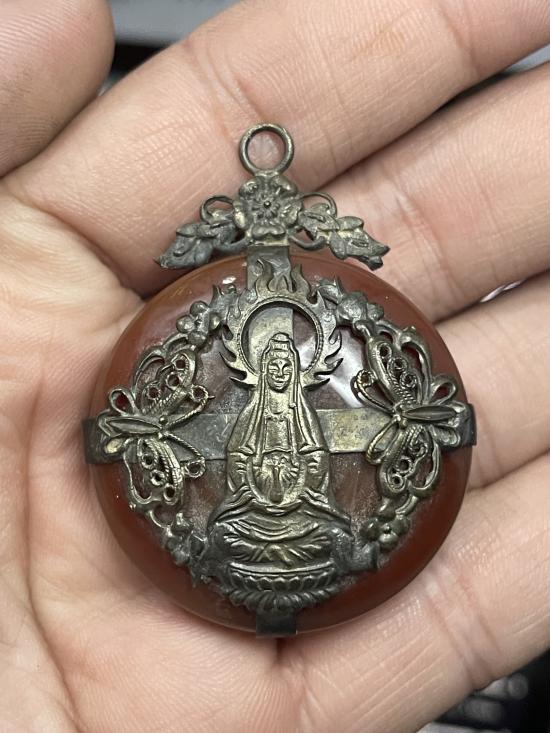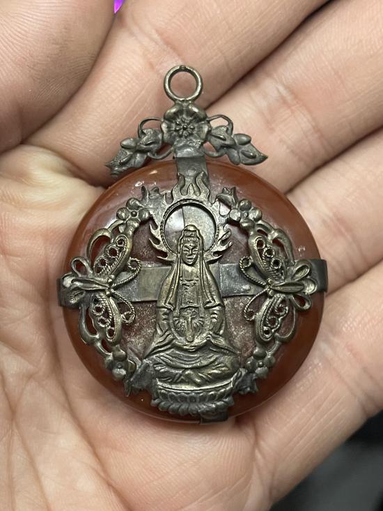 หยกโมราสีแดงแกะสลักรูปเจ้าแม่กวนอิม จับขอบด้วยเนื้อเงินครับ