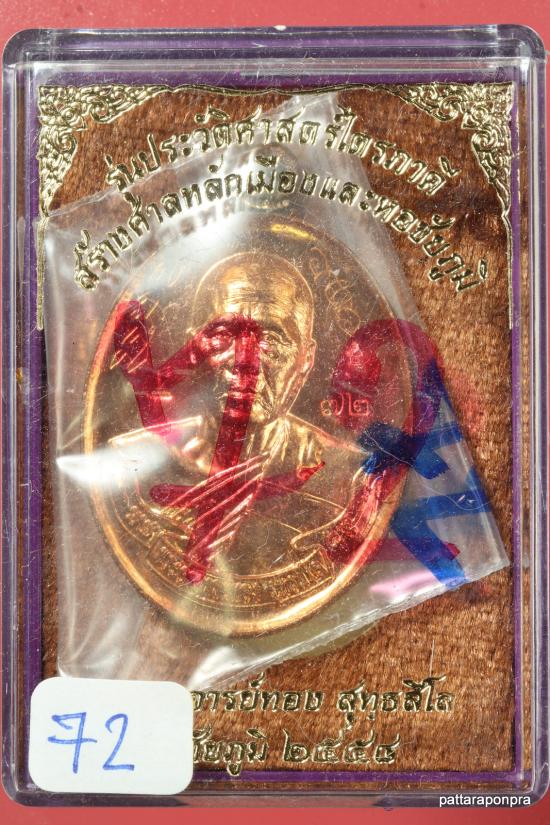 เหรียญหลวงพ่อทอง รุ่นประวัติศาสตร์ไตรภาคี ปี 2558 เนื้อทองแดง มีจาร โค๊ต๙ กรรมการ หมายเลข 72 |