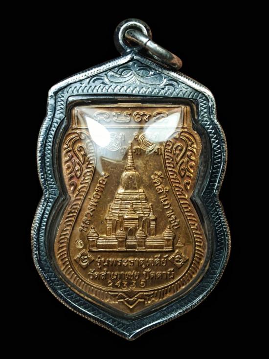 ชื่อพระเครื่อง เหรียญเสมาพุทธซ้อน หลวงพ่อทวด รุ่นพระธาตุเจดีย์ ปี49 เนื้อทองเหลือง วัดสำเภาเชย จ.ปัตตานี หมายเลข 24335 พร้อมเลี่ยมกรอบเงิน