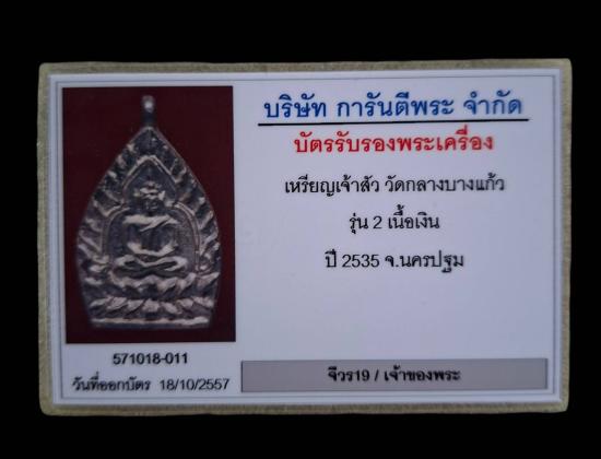 เหรียญเจ้าสัว 2 เนื้อเงิน เลี่ยมทอง ปี2535 วัดกลางบางแก้ว ตอกโค้ดชัดเต็มใบ มีบัตรก่อนเหลี่ยมทองครับ สวยๆ ราคาเบาๆ