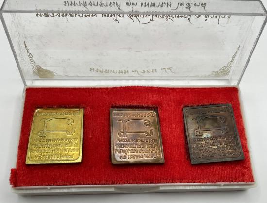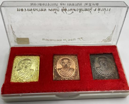 เคาะเดียวแดง เหรียญแสตมป์ รุ่น มงคลเกษม7รอบ ปี 38 ประกอบด้วย เนื้อนวะโลหะ เนื้อทองเหลือง และเนื้อทองแดง พร้อมกล่อง |