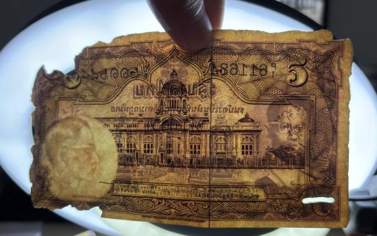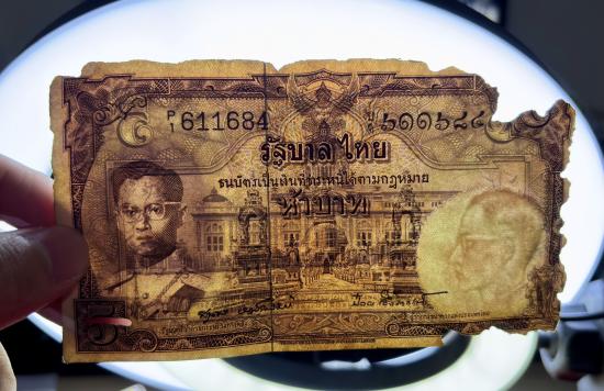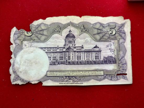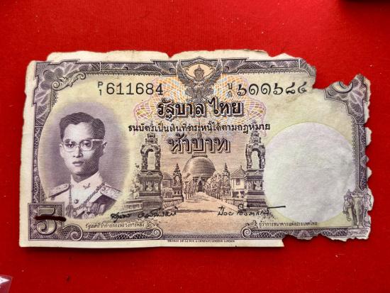 แบ่งเคาะเดียว_50_แดง (สภาพชำรุดน่ารัก) ธนบัตร ยุครัชกาลที่ 9 ธนบัตร 5 บาท รุ่น 5 (ปี 2500 - 2512) ลายเซ็น สุนทร-ป๋วย |