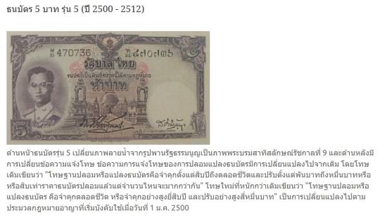 ด้านหนัาธนบัตรรุ่น 5 เปลี่ยนภาพลายน้ำจากรูปพานรัฐธรรมนูญเป็นภาพพระบรมสาทิสลักษณ์รัชกาลที่ 9 และด้านหลังมีการเปลี่ยนข้อความแจ้งโทษ ข้อความการแจ้งโทษของการปลอมแปลงธนบัตรมีการเปลี่ยนแปลงไปจากเดิม โดยโทษเดิมเขียนว่า "โทษฐานปลอมหรือแปลงธนบัตรคือจำคุกตั้งแต่สิบปีถึงตลอดชีวิตและปรับตั้งแต่พันบาทถึงหมื่นบาทหรือหรือสิบเท่าราคาธนบัตรปลอมแล้วแต่จำนวนไหนจะมากกว่ากัน" โทษใหม่ที่หนักกว่าเดิมเขียนว่า "โทษฐานปลอมหรือแปลงธนบัตร คือจำคุกตลอดชีวิต หรือจำคุกอย่างสูงยี่สิบปี และปรับอย่างสูงสี่หมื่นบาท" เป็นการเปลี่ยนแปลงไปตามประมวลกฎหมายอาญาที่เริ่มบังคับใช้เมื่อวันที่ 1 ม.ค. 2500