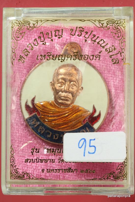 เหรียญหลวงปู่บุญ สวนนิพพาน วัดปอแดง รุ่นหมุนเงินหมุนทอง ปี 2560 เนื้อทองแดงลงยาขาว หมายเลข 95