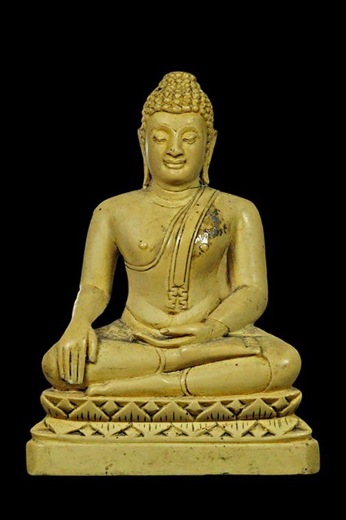 พระพุทธรูป หลวงพ่อกวย พิมพ์สุโขทัย มารวิชัย ปี 2518 เนื้อเรซิ่น วัดโฆสิตาราม จ.ชัยนาท (หน้าตัก 3 นิ้ว) หมายเหตุ เกศชำรุด |