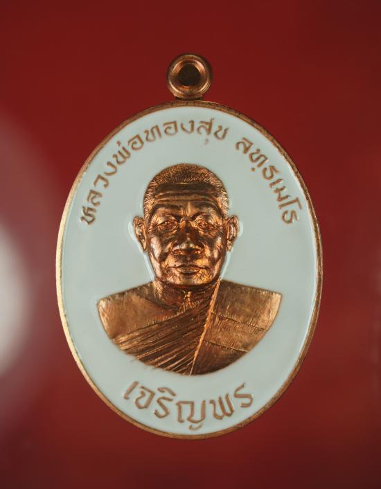 เหรียญเจริญพรเลี่อนสมณศักดิ์ เนื้อทองแดงผิวไฟส้ม ลงยาพื้นขาว หน้าเจริญพร สร้างน้อย 760 เหรียญ หมายเลข 266 หลวงพ่อทองสุข วัดหนองฆ้อ ระยอง พร้อมกล่องเดิมจากวัด ( ขนาดความสูง 4.3 ซม. กว้าง 3 ซม. ) |
