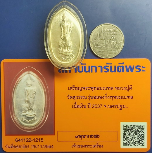 ๙๙๙๙๙๙๙๙๙**เหรียญพระพุทธมณฑล หลวงพ่อดี วัดสุวรรณาราม จ.นครปฐม ((รุ่นฉลองกิ่งอำเภอพุทธมณฑล)) สร้างปี2537 ((เนื้อเงิน)) เหรียญสวยคมชัดลึก+เลี่ยมพลาสติกกันน้ำ+พร้อมบัตรรับรองพระแท้ครับ**๙๙๙๙๙๙๙๙