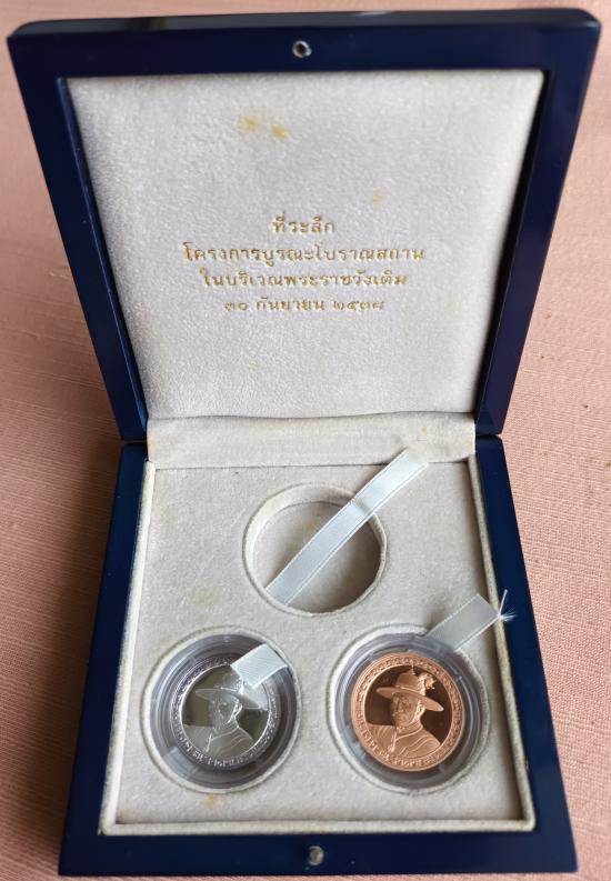 *เคาะเดียว 2 เหรียญ* เหรียญสมเด็จพระเจ้าตากสินมหาราช การบูรณะโบราณสถานในพระราชวังเดิม ปี2538 ((( เนื้อเงิน + เนื้อทองแดง ขัดเงา ))) กล่องเดิม+การ์ด