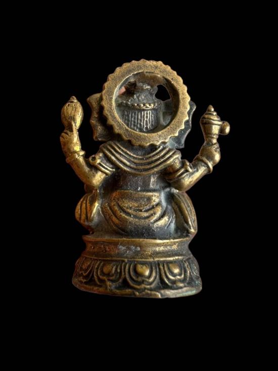 เนื้อโลหะผสมเก่า เดินทองธรรมชาติผิวเดิม คราบอายุขึ้นสวยมาก ฐานด้านล่างมีรอยเก่าตามกาลเวลา เป็นงานเก่าที่ได้พลังสายฮินดูเต็ม ๆ เชื่อกันว่าพระพิฆเนศช่วยเปิดทางสำเร็จ งานราบรื่น ค้าขายดี มีผู้ใหญ่เมตตา อุปสรรคหลบหลีก (เคาะเดียวแดง)