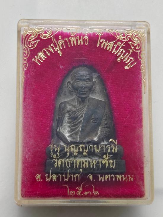 รูปหล่อเหมือนพิมพ์หลังเตารีด หลวงปู่คําพันธ์ รุ่นบุญญาบารมี ปี พ.ศ 2536 เนื้อนวะโลหะ เลข 516 กล่องเดิม สภาพสวยเดิม