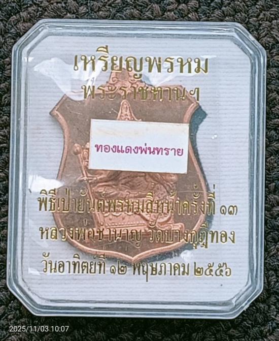 เหรียญพรหมพระราชทาน หลวงพ่อชำนาญ วัดบางกุฎีทอง จ.ปทุมธานี เหรียญแจกทาน เนื้อทองแดงพ่นทราย ปี 2556 หมายเลข 1132 |