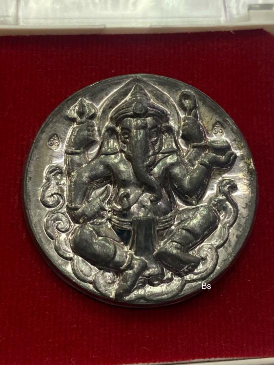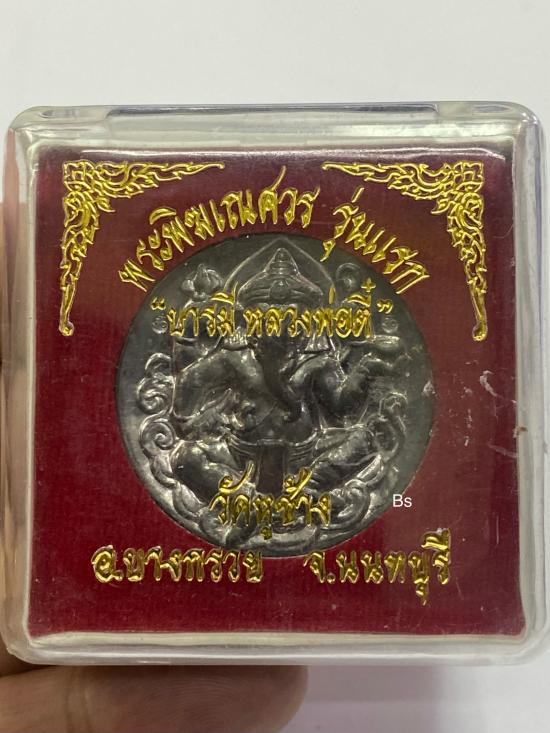 เหรียญพระพิฆเนศ รุ่นแรก บารมี หลวงพ่อตี๋ หลวงพ่อตี๋ วัดหูช้าง นนทบุรี เนื้อตะกั่วหลังเรียบ มีจาร พร้อมกล่องเดิม