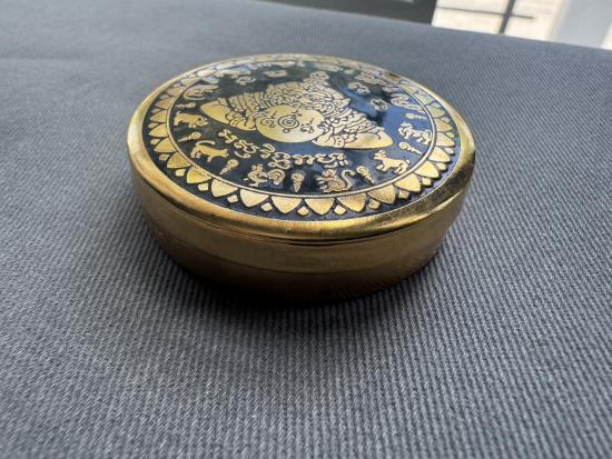 เคาะเดียวไวไว ตลับสีผึ้งพระราหู มหานิยมอุดมโชค จตุคามรามเทพ รุ่น มงคลจักรวาล ปี2549 พิมพ์ใหญ่ ขนาด5.5ซม ลงยาดำ ลงเบญจรงค์น้ำทอง สีผึ้งด้านในเดิมๆ |