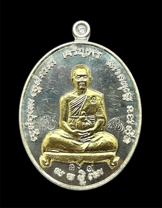 เหรียญเจริญพร (บน) พระอาจารย์จิ วัดหนองหว้า เพชรบุรี (ศิษย์หลวงพ่อยิด วัดหนองจอก) เนื้อเงินหน้ากากทองคำหลังเรียบจาร หมายเลข 9