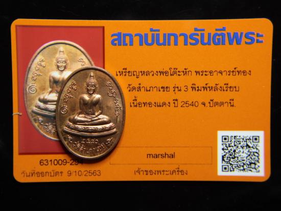 วัดใจ เหรียญหลวงพ่อโต๊ะหัก หลังเรียบ อาจารย์ทอง วัดสำเภาเชย ปัตตานี เนื้อทองแดง ปี2540 พร้อมบัตรG เช่าได้สบายใจ #12 |