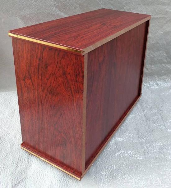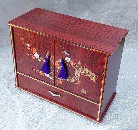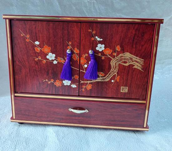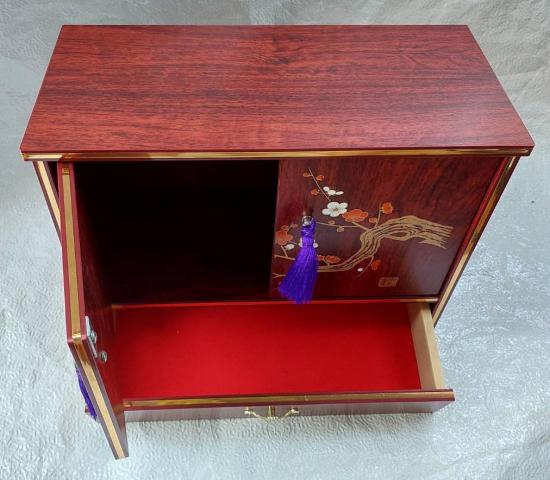 ตู้ไม้สีแดงเข้ม มีการตกแต่งลวดลายดอกบ๊วยหรือดอกซากุระ