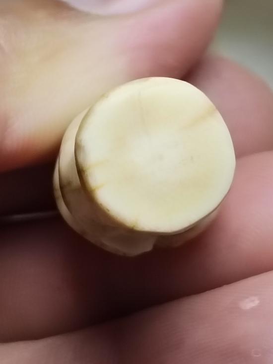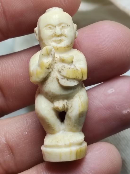 กุมารทองกวัก ถือถุงเงินถุงทอง แกะมือเก่า ไม่ทราบเนื้อ น่าจะเป็น กระดูกหรือกราม ไม่ทราบที่