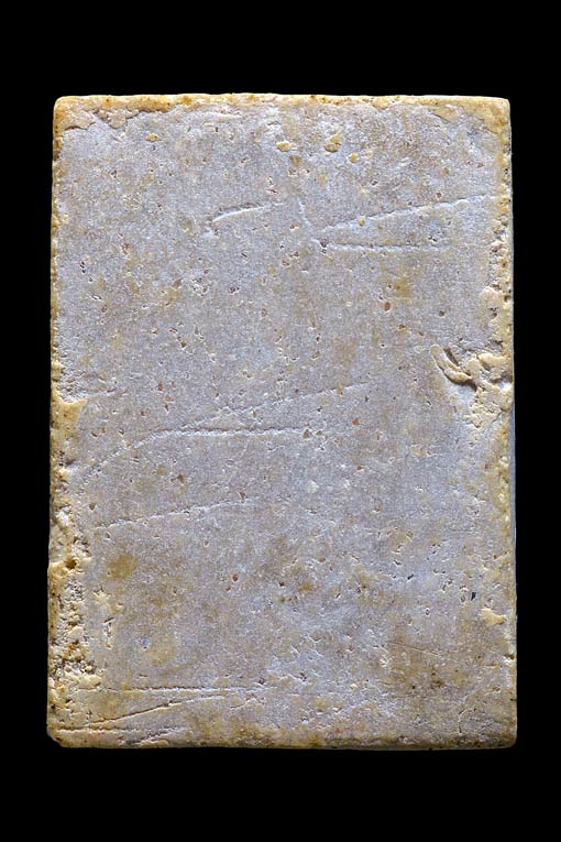 30.พระพิมพ์สามเหลี่ยม ปางประทานพร ด้านหน้ายันต์พุทโธ ด้านหลังยันต์เฑาะว์ เนื้อผงสีเทา ( คุณสุขสันต์ พรจินดา " โกหย่ง " ศิษย์วัดนครอินทร์ สร้างถวาย ประมาณราวๆ 2000 องค์ มีหลายๆองค์ ที่ฝังตะกรุดชายจีวร หลวงพ่อคูณ ขนาด ยาว 1.5 เซนติเมตร ความหนาเท่าๆก้านไม้ขีด ไว้ที่ขอบฐานด้านล่างขององค์พระ เพื่อความแตกต่างเลยผสมผงธูปเข้าไปด้วย สีขององค์พระเลยออกมาโทนสีเทา |
