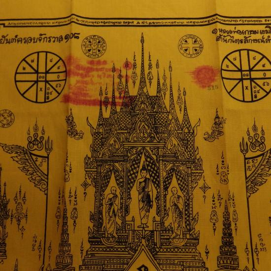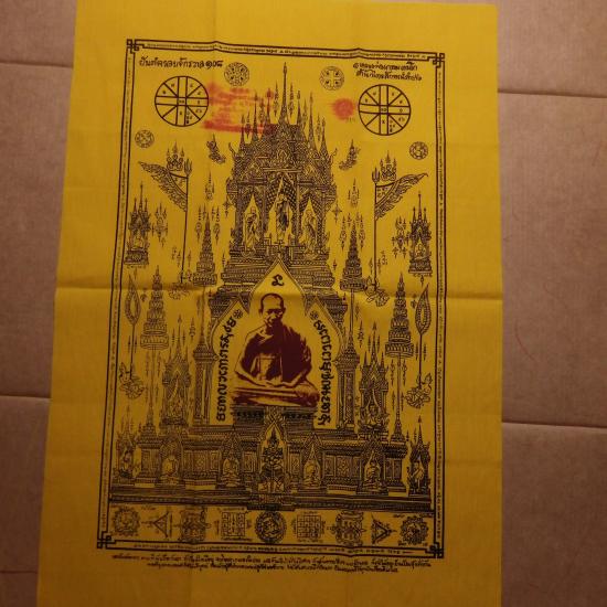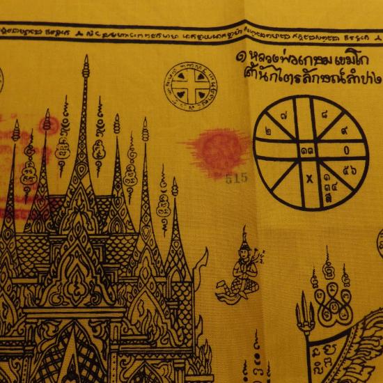 ผืนใหญ่..ขนาด19 X 29 นิ้ว... ผ้ายันต์ครอบจักรวาล 108 หลวงพ่อเกษม รุ่นพุทธคุณ ปี2538 เลข 515 ... 68.9.26