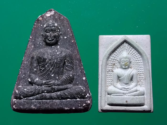 140 .- วัดใจ.@@ เหมา 2 องค์> " พระผงนิลกาฬ หลังยันต์ นะมีเขี้ยว ซึ่งเป็นยันต์หลวงปู่มั่น + พระผงหยก " หลวงพ่อวิริยังค์ วัดธรรมมงคล ค่ะ @@