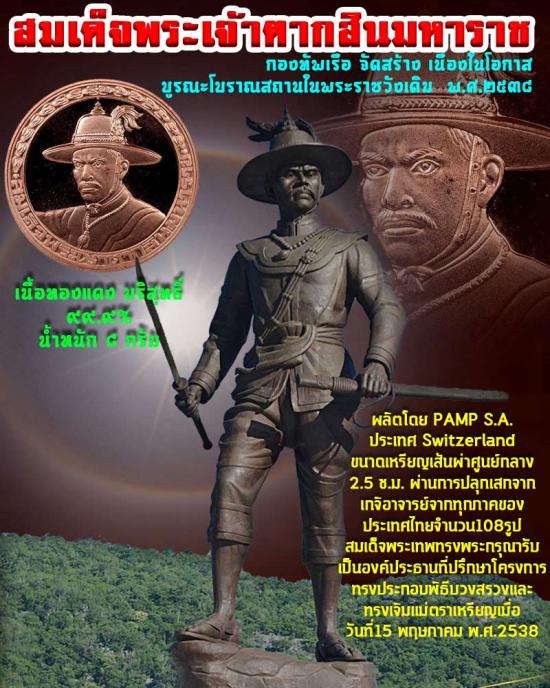 เหรียญพระเจ้าตากสิน รุ่นบูรณะพระราชวังเดิม ปีพ.ศ.2538 เนื้อทองแดงขัดเงา เนื้อทองเเดงขัดเงา พ.ศ.๒๕๓๘ ที่ระลึกในโอกาสบูรณะโบราณสถานในพระราชวังเดิม ผลิดโดย PAMP SA.ประเทศ Switzerland