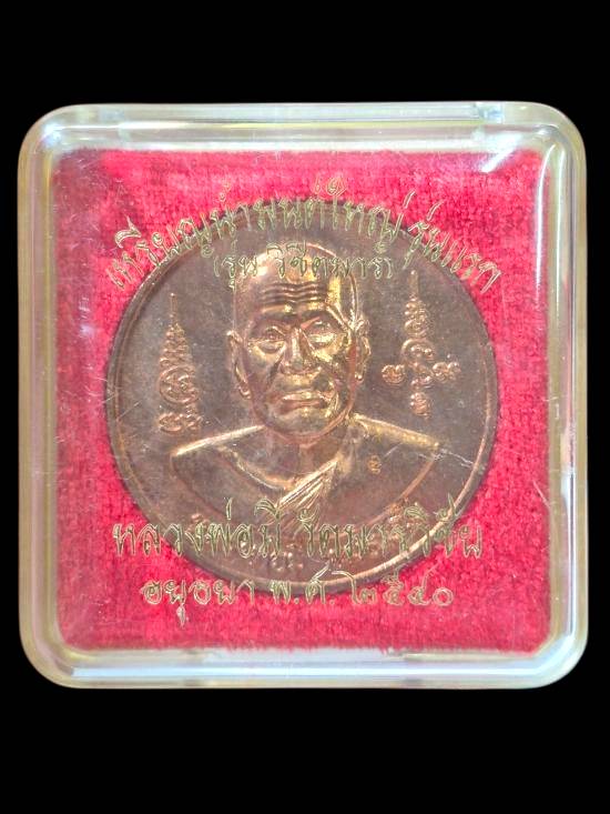 เหรียญน้ำมนต์ใหญ่(รุ่นแรก) รุ่นวิชิตมาร หลวงพ่อมี วัดมารวิชัย อยุธยา สร้างปี ๒๕๔๐ เนื้อทองแดง พร้อมกล่องเดิมๆ เคาะเดียว