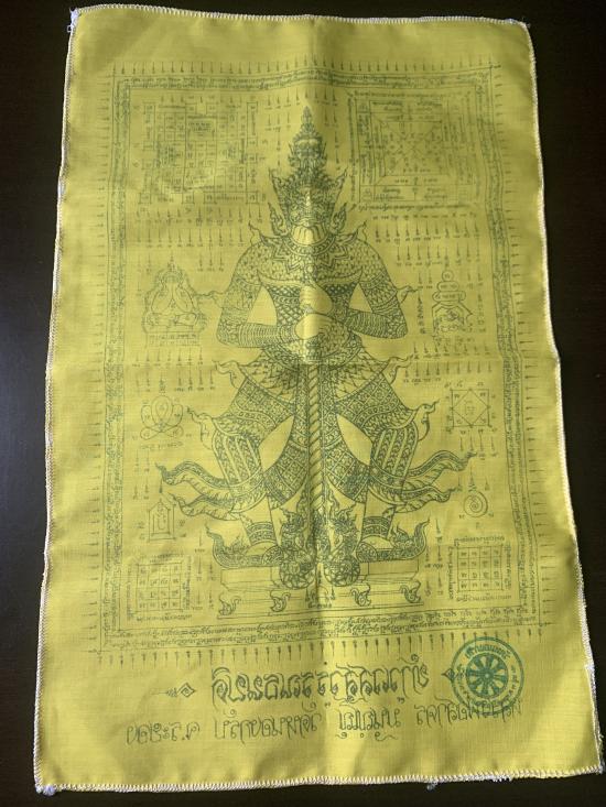 ผ้ายันต์เหลืองท้าวเวสสุวรรณธนบดี หลวงพ่อสาคร มนุญโญ วัดหนองกรับ ขนาดประมาณ 12 x 18 นิ้ว