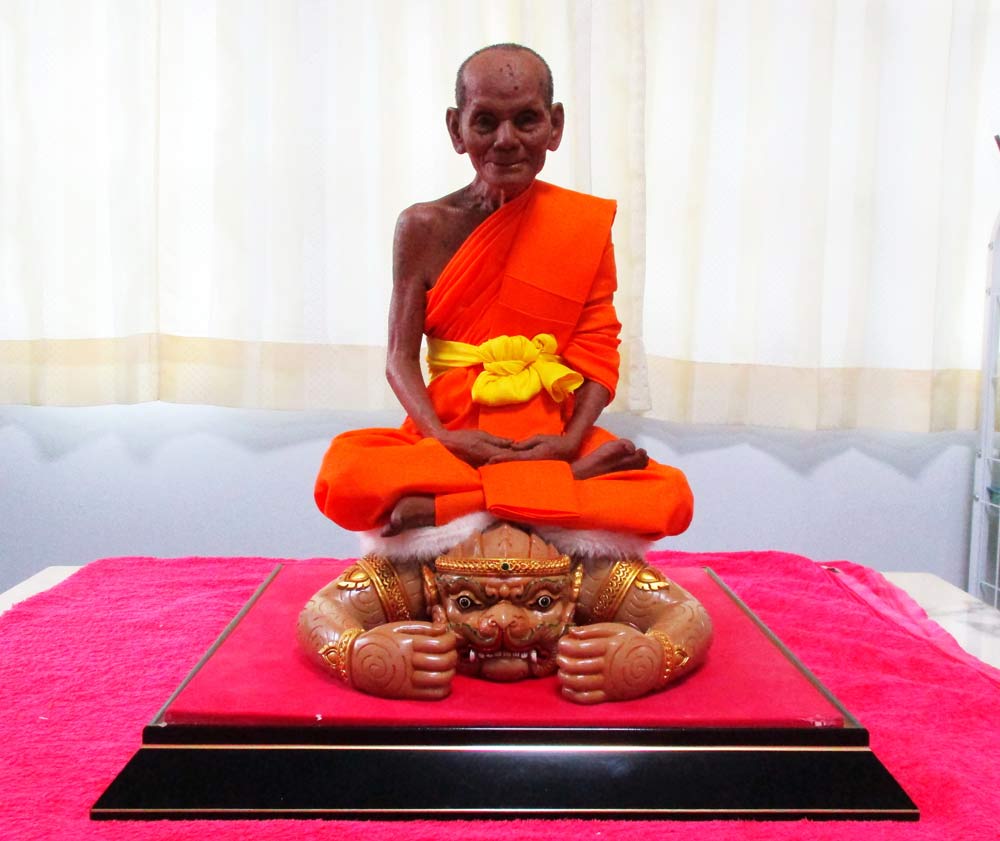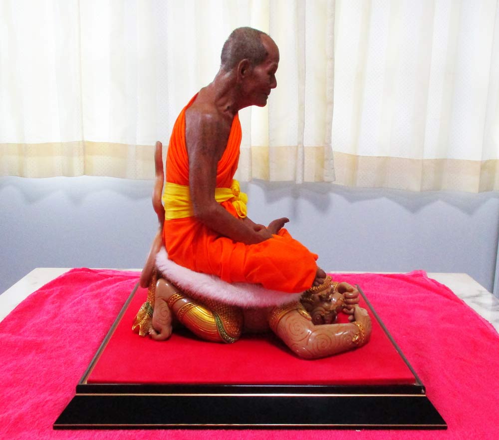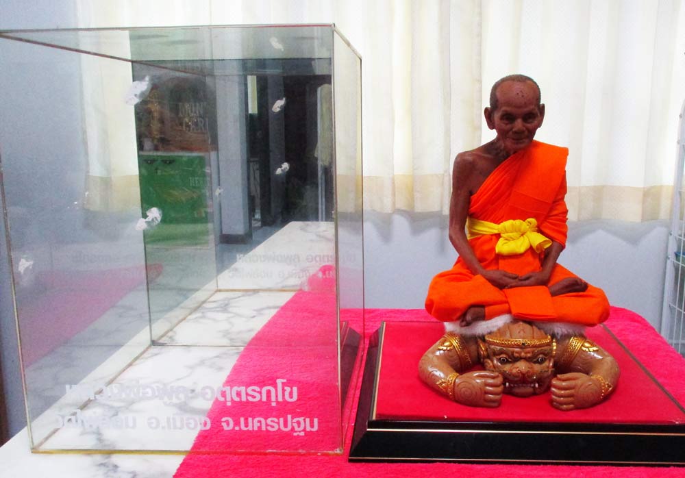 พระบูชารูปเหมือนหลวงพ่อพูล วัดไผ่ล้อม จ.นครปฐม พ.ศ.2547 ประทับนั่งเหนือเทพหนุมานครองเมือง เนื้อไฟเบอร์กลาสห่มจีวรรุ่นแรก หน้าตัก 9 นิ้ว พร้อมครอบกระจก !!