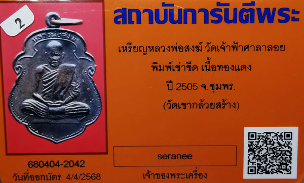 เหรียญรุ่นแรก หลวงพ่อสงฆ์ วัดเจ้าฟ้าศาลาลอย พิมพ์เข่าขีด เนื้อทองแดง ห่วงเดิม ปี2505 จ.ชุมพร(วัดเขากล้วยสร้าง)+ บัตรG-pra สภาพเดิมค่ะ