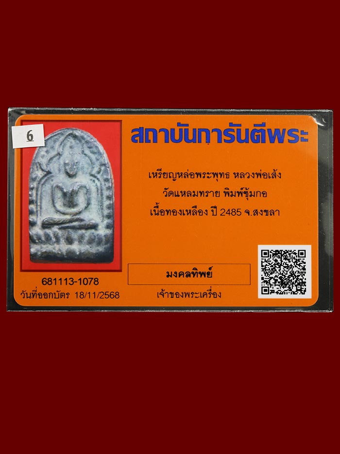 วัดใจ เหรียญหล่อพระพุทธ หลวงพ่อเส้ง วัดแหลมทราย เนื้อทองเหลือง ปี2485 พร้อมบัตรจีพระครับ องค์ที่1