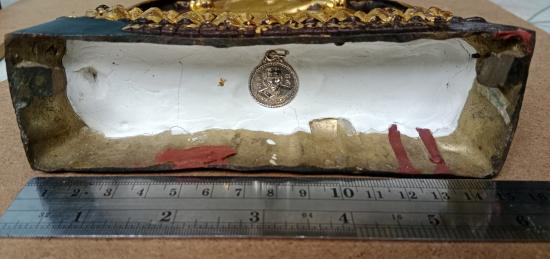พระบูชาขนาดใหญ่ มั่ง มี ศรี สุข หลวงพ่อทาวัดพะเนียงแตก ปี2539 เนื้อโลหะ ลงทอง ความสูง 10 นิ้ว ความกว้าง 6 นิ้ว สองหน้า หลวงพ่อทา+พระสังกัจจายน์ ใต้ฐานฝังเหรียญ ตามรูป |