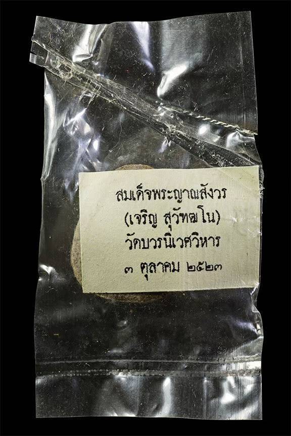 พระปิดตายันต์ดวงเล็ก หรือยันต์ดวงสุกิตติมา ตะกรุดเงิน เนื้อผงใบลานแช่น้ำมนต์(คราบน้ำมนต์หนา) สมเด็จพระญาณสังวร(เจริญ สุวัฑฒโน ปธ.๙) พิธีพุทธาภิเษก ณ พระอุโบสถคณะรังสี วัดบวรนิเวศวิหาร ๒ ตุลาคม ๒๕๒๓ หลวงปู่โต๊ะ วัดประดู่ฉิมพลี ร่วมปลุกเสก สมเด็จพระญาณสังวรฯทรงจุดเทียนชัยและประธานอธิษฐานจิต พร้อมด้วยพระคณาจารย์แห่งยุคอีกหลายรูป ไม่มีกล่อง เคาะเดียว