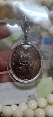 เหรียญไตรสรณคมน์ เนื้อทองแดง หลวงตาม้า วัดถ้ำเมืองนะ พร้อมรอยจารหลวงตาม้า เลี่ยมจากวัดพร้อมประคำ