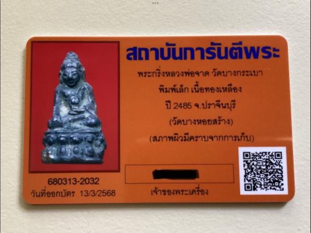 เคาะเดียวแดงพระกริ่งหลวงพ่อจาด วัดบางกระเบา ปี 2485 พิมพ์เล็ก ออกวัดบางหอย สภาพสวยมาพร้อมบัตรรับรอง G pra |