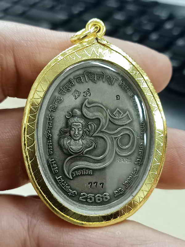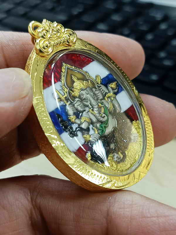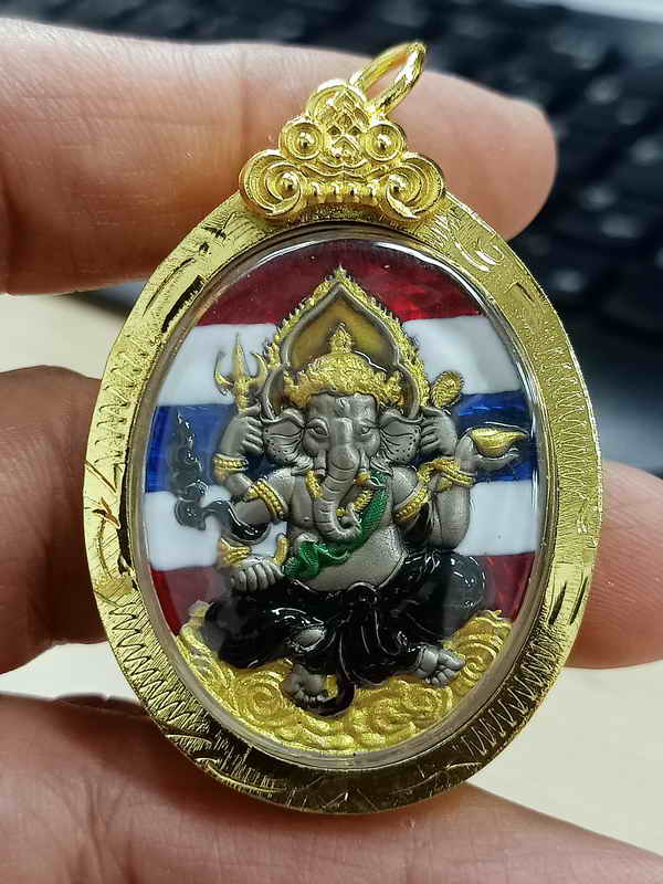 วัดใจ 150 พร้อมใช้ เหรียญรุ่น คเณชา ราชาโชค พระพิฆเนศ เทวสถานอุทยาน พระพิฆเนศ จ.นครสวรรค์ อัลปาก้าซติน ลงยาธงชาติ ลงยาครื่องทรง เลี่ยมกรอบชุบทองคำแท้ หมายเลข 777 สร้าง 12 กล่องเดิม |