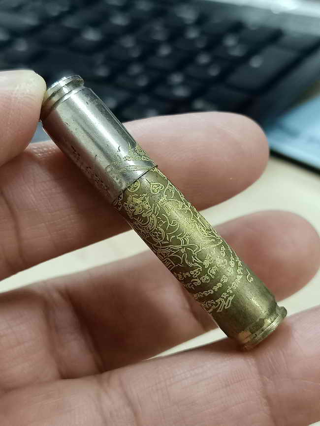 วัดใจ 100 ตะกรุดปลอกลูกปืน ชนะศึก หลวงปู่บุญมา สำนักสงฆ์เขาแก้วทอง จ.ปราจีนบุรี 2568 ปลอกลูกปืน ยันต์หนุมาน หมายเลข 8 สร้าง 9 กล่องเดิม |