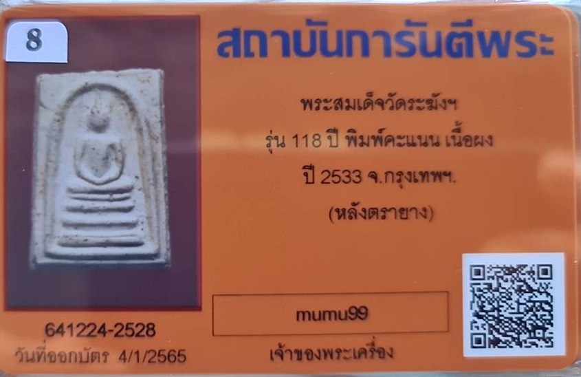 ## สมเด็จวัดระฆัง อนุสรณ์ 118ปี พ.ศ.2533 พิมพ์คะแนน "พระสวยเดิมไม่ผ่านการใช้.หลังปั้มตรายาง...พร้อมบัตรรับรอง.""รับประกันแท้ตลอดฃีพและแท้ตามมาตรฐานสากล....... อนาคตดี ถูกๆเลยครับ.... ราคายังไม่แรง....ไปออกต่อได้เลยครับ...แท้...ถูก...ดี...น่าเก็บมาก.. |