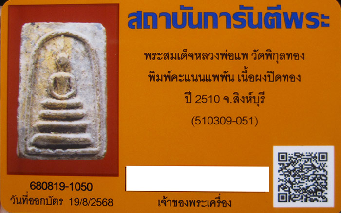 พระสมเด็จคะแนนแพพัน หลวงพ่อแพ วัดพิกุลทอง ปี2510 สภาพสวย ปิดทองในพิมพ์ พร้อมบัตรรับรอง