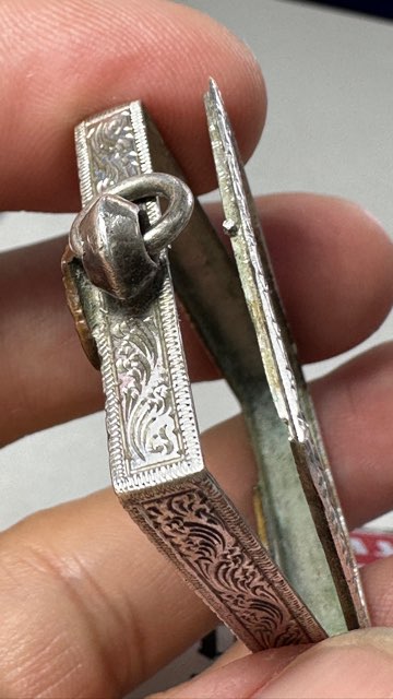 ตลับเงินงานเก่า ปิดฝาหลังแบบเดือย สวยคลาสสิค หน้าสิงห์ไม่แน่ใจว่านากหรือทองแดง(ขายเป็นทองแดงละกันครับ) ขนาดหน้าจอสูง 3.8ซ.ม.กว้าง2.8ซ.ม.ด้านข้างวัดข้างใน5มิลล์ ดองพิจารณาดูครับ |