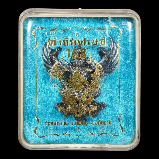 พญาครุฑ ผู้ทรงอิทธิฤิทธิ์ทั่วหล้า ปฐมบทแห่งครุฑ รุ่นคัมภีร์เศรษฐี 168 วัดหนองไผ่ อ.ทับทัน จ.อุทัยธานี เนื้อมหาชนวนเจ้าน้ำเงิน บุศราคัม หมายเลข ๒๑๕ พร้อมกล่องเดิม พิมพ์ใหญ่ ขนาดสูง 4 ซม. |