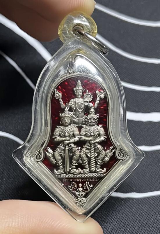 เหรียญท้าวเวสสุวรรณโณ จตุมหาราชิกา พิมพ์ทรงจำปี 3 เทพ (สามเทพ) รุ่น 1 มีแล้วไม่จน หลวงพ่ออิฐ วัดจุฬามณี เนื้อซาติน ลงยาราชาวดีสีแดง ปี 2564 |