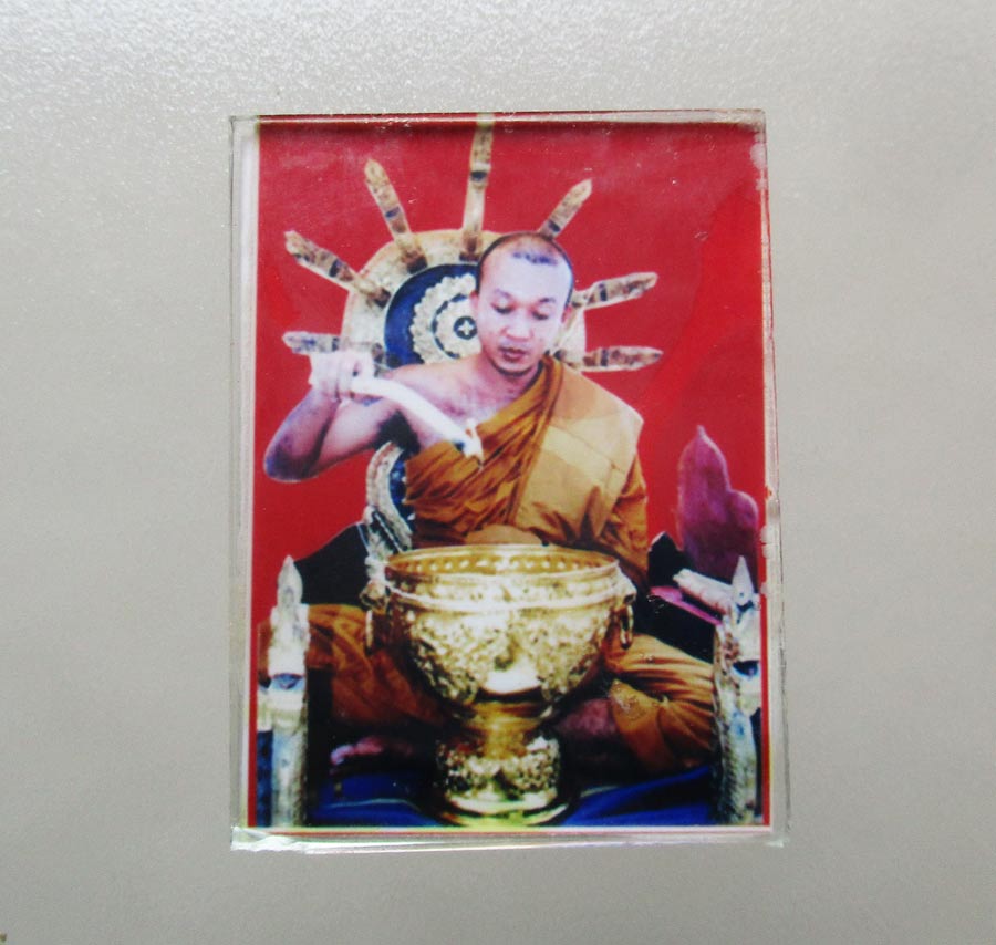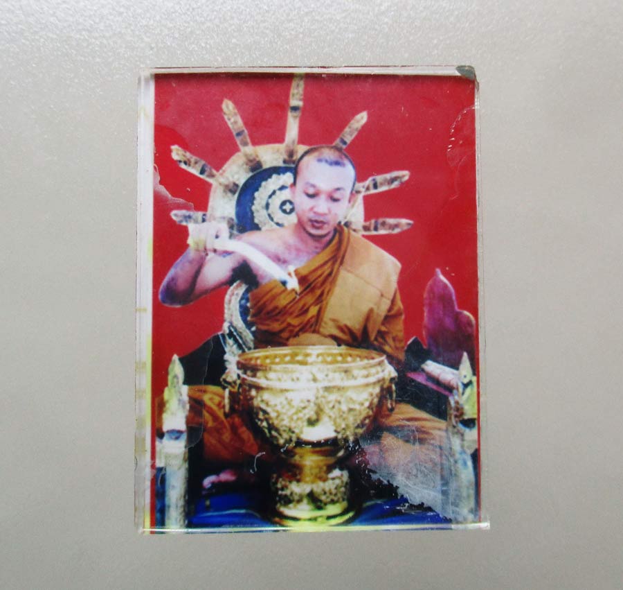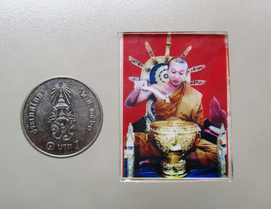 รูปถ่ายสีอัดกระจก นั่งทำน้ำมนต์บนโต๊ะธรรมาสน์มอญ 2 หน้า หลวงพ่อชำนาญ อุตตมปัญโญ วัดบางกุฎีทอง จ.ปทุมธานี