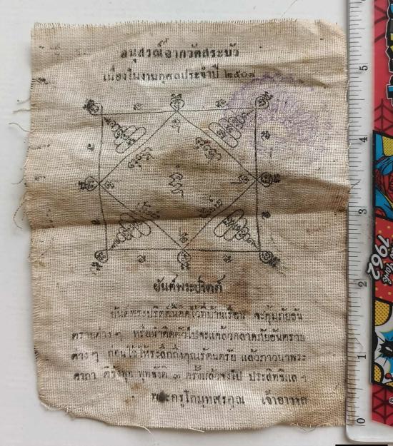 พร้อมกันทีเดียว 2 ผืน ครับ ผ้ายันต์พระปริตต์ พระครูโกมุทสรคุณ วัดสระบัว กทม. ปี 2508 หลวงพ่ออินทร์ วัดสระบัว ท่านเป็นพระศักดิ์สิทธิ์และมีวิชาอาคมสูง ข้อความบนผ้ายันต์ " ยันต์พระปริตต์นี้ติดไว้ที่บ้านเรือน จะคุ้มภัยอันตรายต่างๆ หรือนำติดตัวไป จะแคล้วคลาดกับอันตรายต่างๆ ก่อนใช้ให้ระลึกถึงคุณรัตนตรัย แล้วภาวนาพระคาถา ติธังพุท พุทธังติ 3 ครั้ง แล้วจงไป ประสิทธิแล * สภาพเก่าเก็บเดิมๆ ขนาดพกพาครับ + ผ้ายันต์ ท้าวเวสสุวรรณมหาราช พระครูสวน อตุตมโน วัดสุวรรณประสิทธิภาวนาราม บึงกุ่ม กรุงเทพ ครับ หายากมากครับ ผืนนี้สร้างในปี 2513 ตอนท่าน เป็น เจ้าอาวาสครับ ขนาด 5.8 นิ้ว x 7.8 นิ้ว
