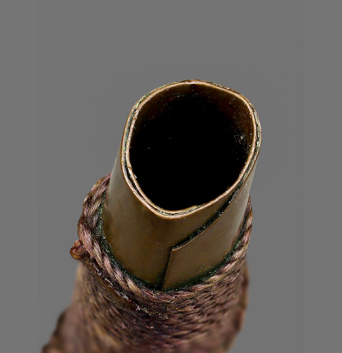 ตะกรุดสาริกา (ไม่ทราบที่) เนื้อทองแดง ถักเชือกเก่ามีอายุ ขนาดตะกรุดยาว 1.45 นิ้ว |