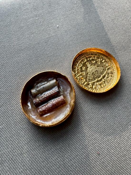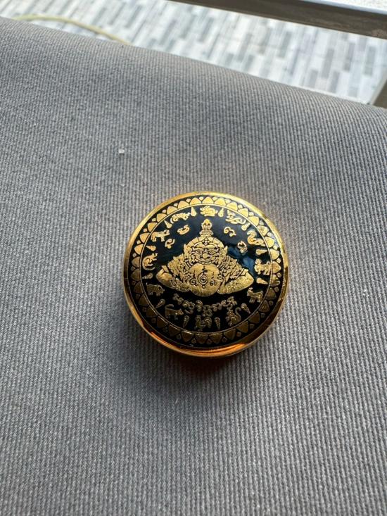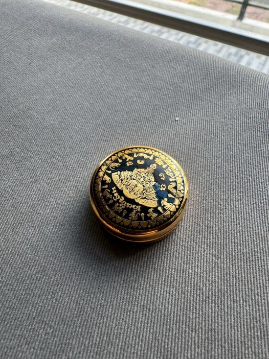 เคาะเดียวไวไว ตลับสีผึ้งพระราหู มหานิยมอุดมโชค จตุคามรามเทพ รุ่น มงคลจักรวาล ปี2549 พิมพ์เล็ก ขนาด3.2ซม ลงยาดำ ลงเบญจรงค์น้ำทอง สีผึ้งด้านในเดิมๆ |