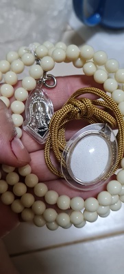 เหรียญหลวงตาม้าหลังท้าวเวสสุวรรณและผงดวงโพธิญาณ พร้อมรอยจารหลวงตาม้า วัดถ้ำเมืองนะประคำขาว เลี่ยมจากวัดพร้อมเชือกร่ม 2 องค์ |