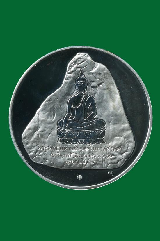 เหรียญในหลวงร.9 ที่ระลึกในการครองสิริราชสมบัติครบ 50 ปี "เนื้อเงิน ขัดเงา" หลังพระพุทธรูปแกะสลักหน้าผาเขาชีจรรย์ ปี 2539 |