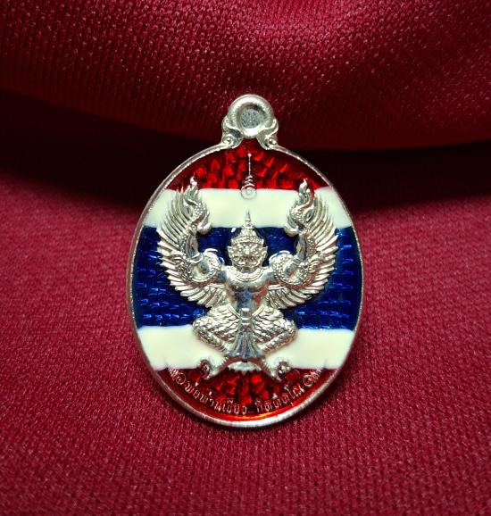 เหรียญพญาครุฑยุดนาค หลังสิงห์ป้อนเหยื่อ ลงยาลายธงชาติ
