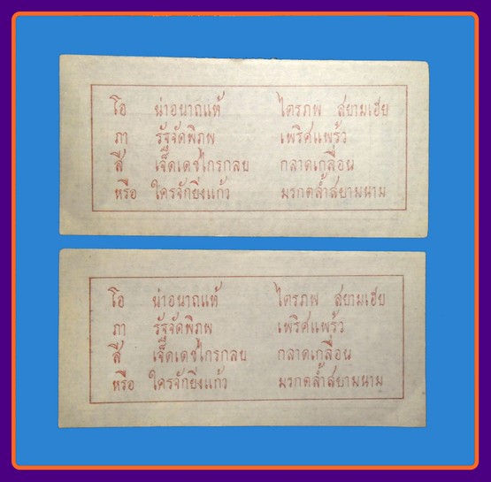 เก่าถึงยุค-นิยม หลังภาษาไทย 2แผ่น-150-กระดาษยันต์กันภัย หลวงพ่อโอภาสี (หายาก ขนาดประมาณ*9.5+5 ซม.* |